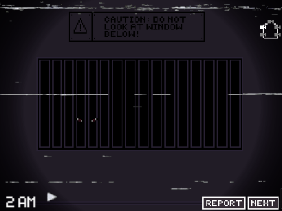 You'll be working as the nightguard at the Hudson Valley Research Institute from 12 PM till 6 AM. Your task is to loop trough the few camera's that the building has, while keeping an eye on every detail of the different rooms. If you see any changes, don't wait! Report it immediatly. If to many of these anomalies are present, you'll no longer be safe and are likely to die. Not sure if there are any changes? Don't report when nothing has changed. The reseachers are not quite sure what would happen when this happens, but it would most likely not be a pleasent experience. A few parts of this game have been inspired by the Five Nights At Freddy's franchise. That is why I made an easter egg for you to find that includes a character from Five Nights At Freddy's.